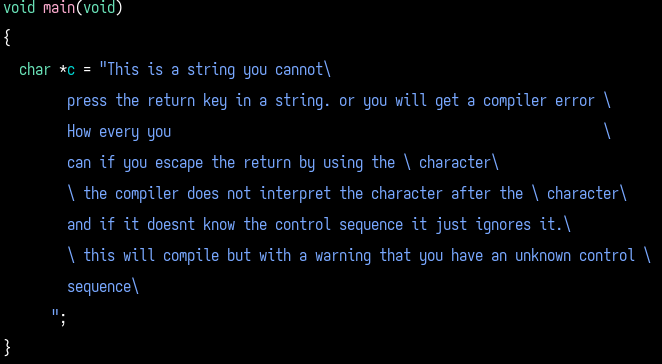 No you cannot. Typing the return key within a "string" will give you compilation error. You must type the control sequence of the ascii char you want to represent. If you want and end of line you type '\n'. On windows systems you do not need to type "some sentence \r\n" The c compiler will automatically make the adjustement for targeting windows systems. However if you inspect a plain text file on a windows systems the last two bytes of each line will be 00001101 00001010