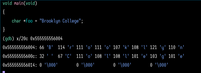 An ascii String in C is a series of Bytes, where the value of each byte is a value on the ascii table, From 0 to 127, where the value 0 is considedred The NULL character. In c, A string is enclosed in "quotes". The variable name that we use to refer to the string holds the address of the first bytes of the string. All strings in C are null terminated, meaning they end in a byte with the value of 0.