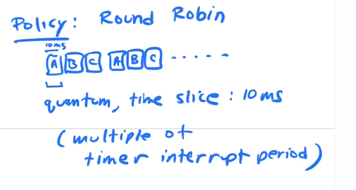 Run a little slice of A, then a Slice of B then slice of C. and continue rotating the jobs on the cpu. That slice is often called a quantum, or a timeslice. It is some multiple of our timer interupt period.