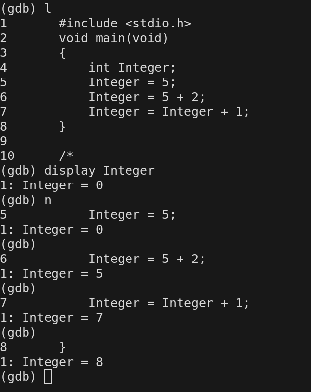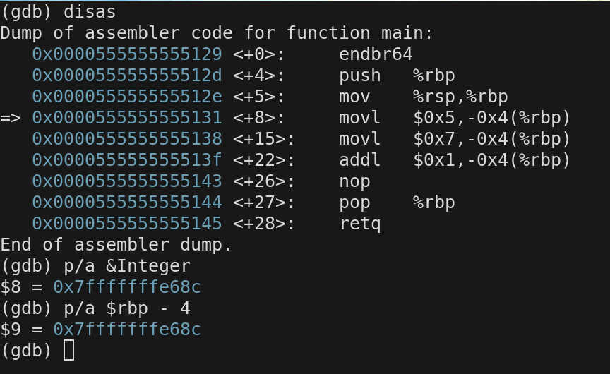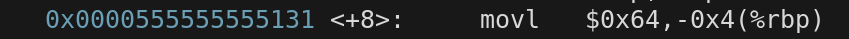 Registers are the fastest form of memory known to mankind. They are located phyiscally on the CPU in each core. In modern cpu's the register are 8 bytes wide that is 64 bits. So far I have mentioned $pc the program counter, which on an x86 cpu is called $RIP, but in gdb you can reference as $pc (program counter). The $rip registers stores the address in memory where the next instruction to be executed is stored. Now I am discussing the $rax register where function store RETURN values right before they exit.