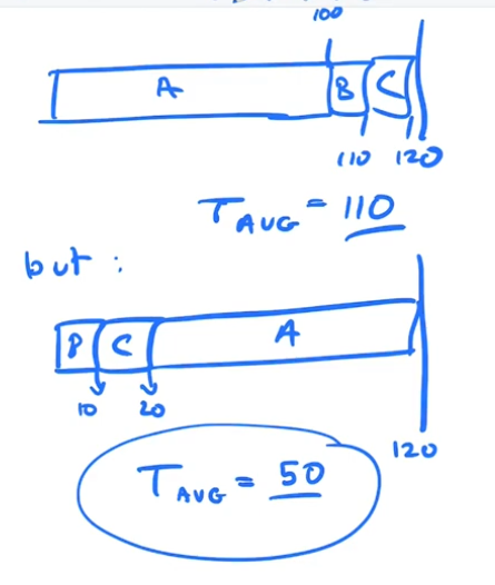 If you make T(A) = 100, T(B) = 10, T(C) = 10, you will notice certain properteis, It seems to make sense to run the shortest job first!!