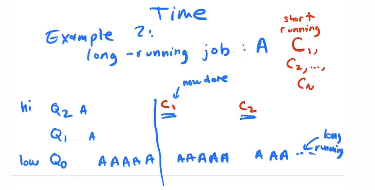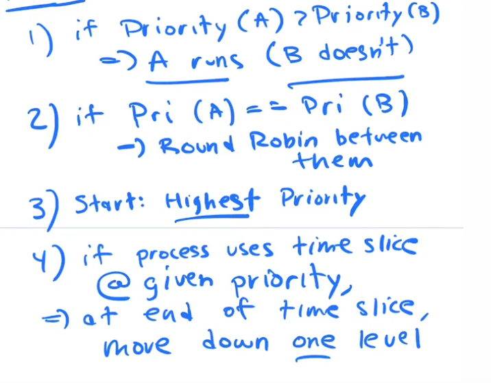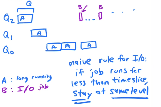 To solve the last problem, the OS keeps track of how much time a process has used up, and once it has used up a full quantum(timeslice) of compute it gets moved down to the next priority q