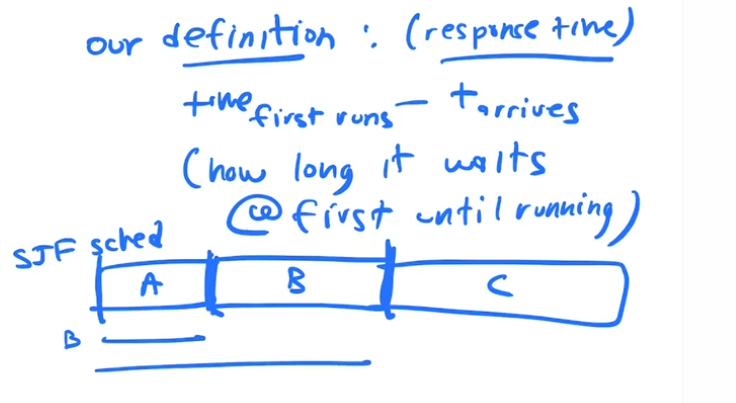 To optimize the this metric we came up with round robin scheduling, using a timeslice(quantum), that is some multiple of our timer interrupt, to switch between jobs. Turnaround time is not that good in round robin scheduling.