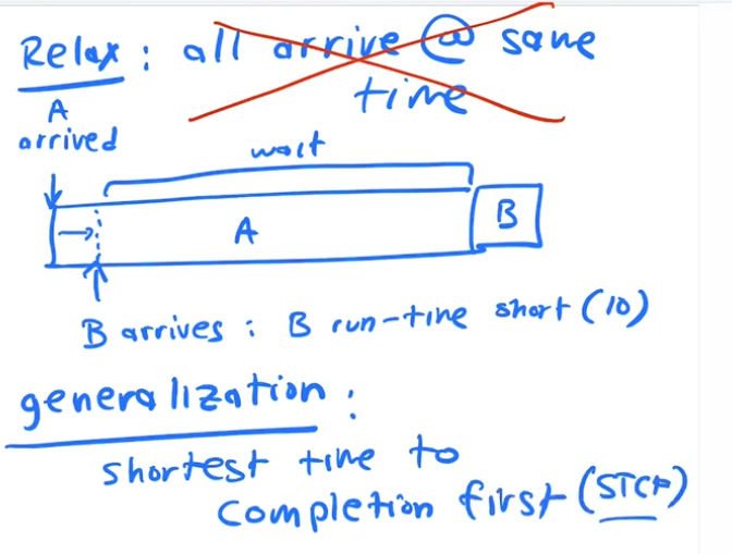 If a job that A is running and Job is comes in, what do we do if the time remaining to finish A Tr(A) is longer than T(B)? We can generalize SJF to next another alogrithm: STCF (shortest time to completion first)
