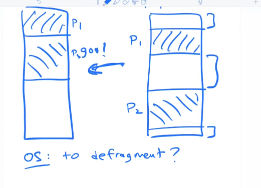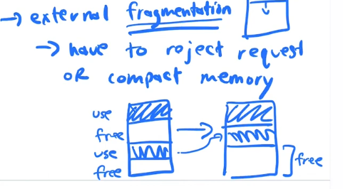 a process my request additional memory and the physical memory may have experienced external fragmentation, that is, fragementation happens outside of our mapped segments. We end up with little chunks(maybe too little to be of use) of free space between our all the different segments from all the processes, this also requires defragmention or compaction which is expensive.