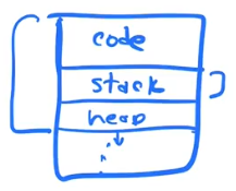 one level is inside the virtual address space of every process. The heap needs to be managed for every process. Processes calll malloc and free to allocate the memory for the heap. The stack also needs to be managed, it is managed by the compiler tool chain
