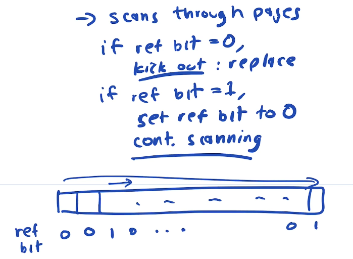 Whenver a page is accessed, the hardware sets a bit in the PTE indicating the page has been accessed. We can call this the accessed bit. When it's time to pick a page to kick out the OS scans the page table for a page where the "Accesed bit" is 0 and kicks it out. If the "referenced" bit is 1 it sets it to 0.