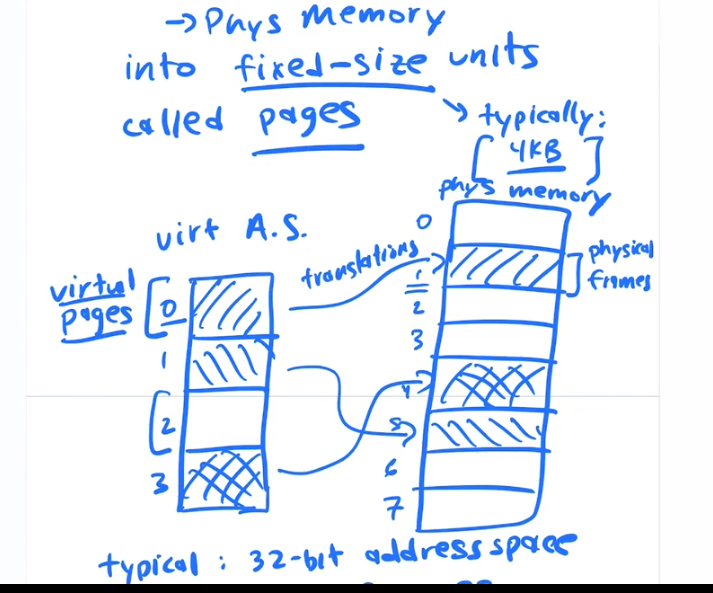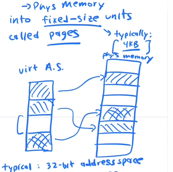Divide up the Virtual address space and the physical memory into FIXED SIZE UNITS called which we call PAGES usually 4kb, 4096 bytesx