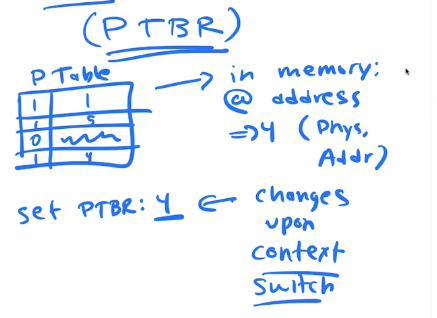 Each CPU has a register on it where it stores the physical address of the current running processes PAGE TABLE. The PTBR changes on every context switch.