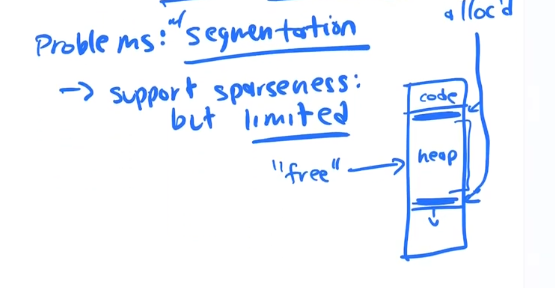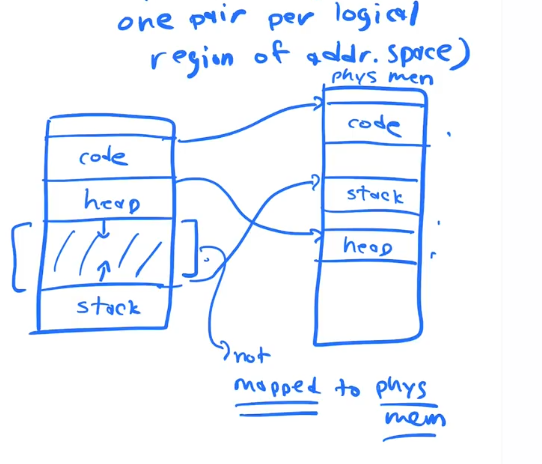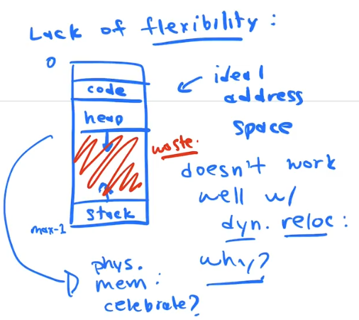 base and bounds/dynamic relocation forces us into an inflexible memory layout. If we wnat to save memory, we are forced to use a small fix sized stack and put the heap on the outside in case we need to grow the process memory at runtime