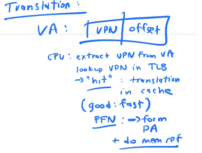 On a TLB hit: The CPU gets the physical frame number (PFN) directly from the TLB using the virtual page number (VPN). It then combines the PFN with the page offset to form the final physical address.